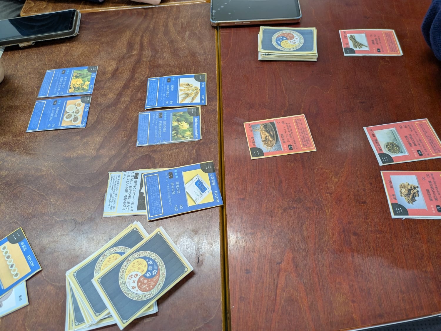 横浜薬科大学の五十鈴川教授や漢方薬メーカーのツムラ社員から漢方の魅力について教えを受け、その魅力に気づいた生徒たちが、漢方に関する知識を面白く習得するための方法としてカードゲームを考案。実際に試作したものを使って参加者とプレイしました。ゲームは二種類作られ、一つは成分や効能が同じものを合わせる「神経衰弱」。もう一つは漢方生薬の効果やスペックで競い合うカードバトル形式。デザインも含めてかなりの完成度です。
